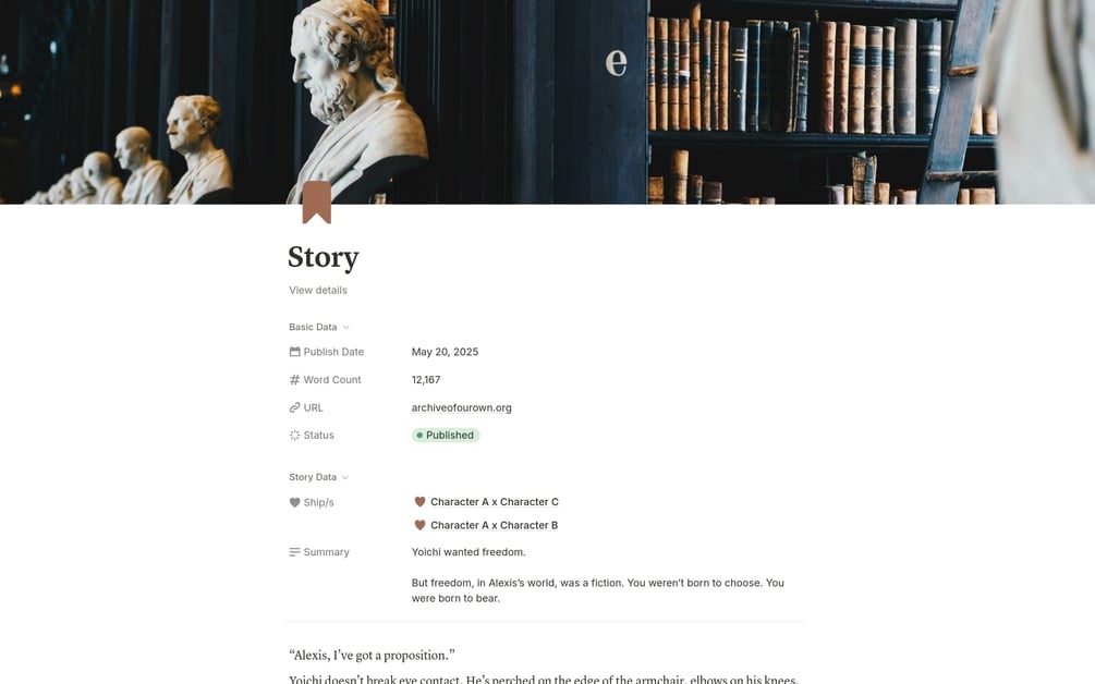 Fanfic Story Manager$3$3https://schema.org/InStockusdWriting Room by VettWriting Room by VettThis is the current template I use to manage my fiction writing.Add to cartAdd to wishlist New wishlistShareShare on XShare on Facebook Copy linkCopy product URLNo refunds allowed